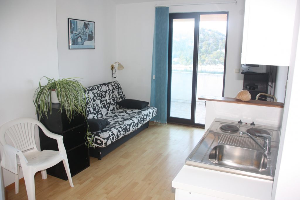 | – 1. kat – Broj kupaonica s tuš kadom: 1 – Ukupan broj ležaja: 4 (2+2) – Tuš na otvorenom – Površina (boravka, blagovaone ili kuhinje): 6 m² – Terasa : 10 m² – Glačalo (usluga na zahtjev) – Posude za pripremanje i serviranje hrane i pića, te pribor za jelo u odgovarajućim količinama – Hladnjak – Klima uređaj – Zamrzivač – Prehranu nudimo u svom restoranu – Čišćenje i pospremanje 1x tjedno – Dozvoljeno pušenje u apartmanu – Mogućnost držanja malih kućnih ljubimaca (plaćanje kod iznajmljivača po dogovoru) – Pogled na: more (sobe), more (dnevni boravak) |